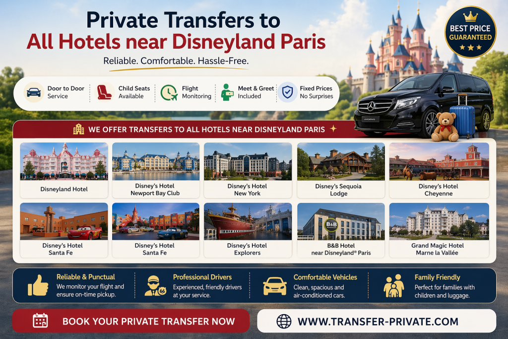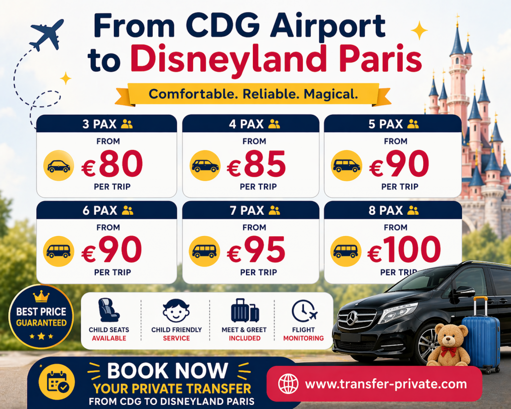 Whether arriving at Charles de Gaulle (CDG) or Orly Airport, private transfers provide fixed pricing, professional drivers, and a seamless door-to-door experience. For travelers heading to Disneyland Paris or central Paris hotels, this is the most efficient and stress-free choice.
